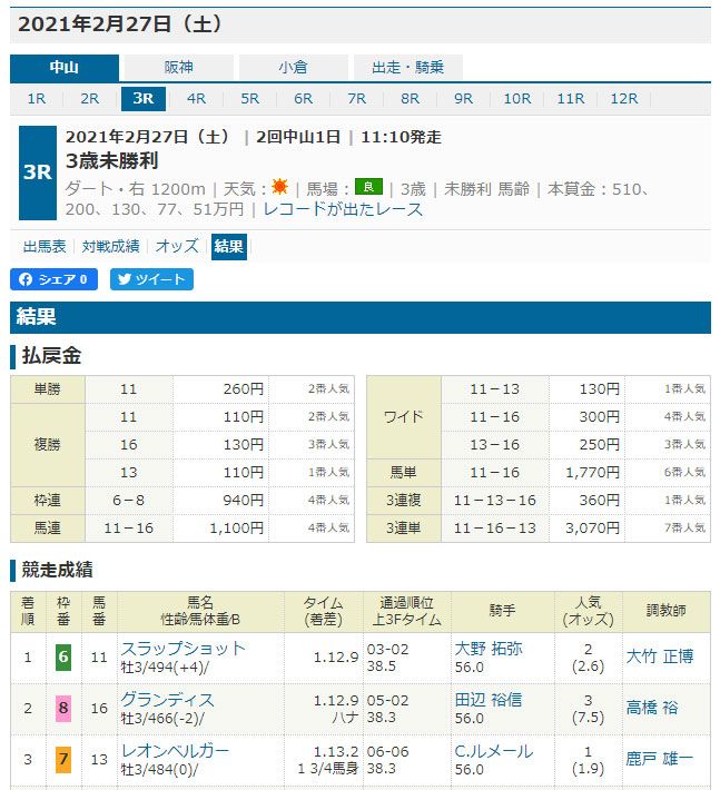 結果2鞍中2鞍不的中で的中率0%。