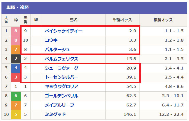 馬連・3連複は3番人気⑩を軸に、中穴馬を相手に入れた買い目。