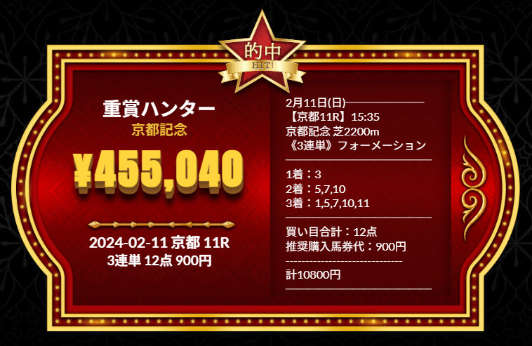 翌日の11日(日)G2京都記念では「45万5040円」獲得大成功!