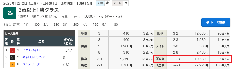 12月2日(土)中京2R3歳以上1勝クラスで無料情報3連複104.3倍的中!