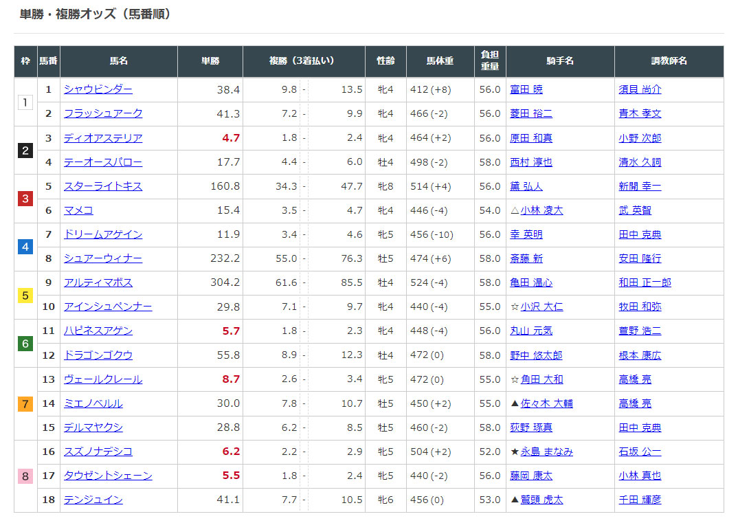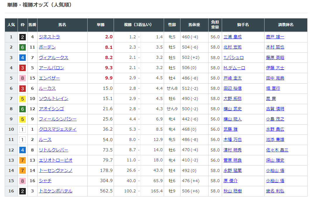 1番人気④ジネストラが1着、⑪ボーデンは7着という結果に・・・