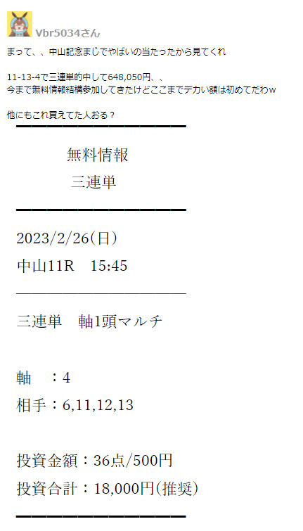 土曜日、管理人田中はボロ負けしてしまいましたが、翌日、日曜の中山11Rで開催されたG2中山記念予想3連単で648,505円の的中口コミを会員様からいただきました!!