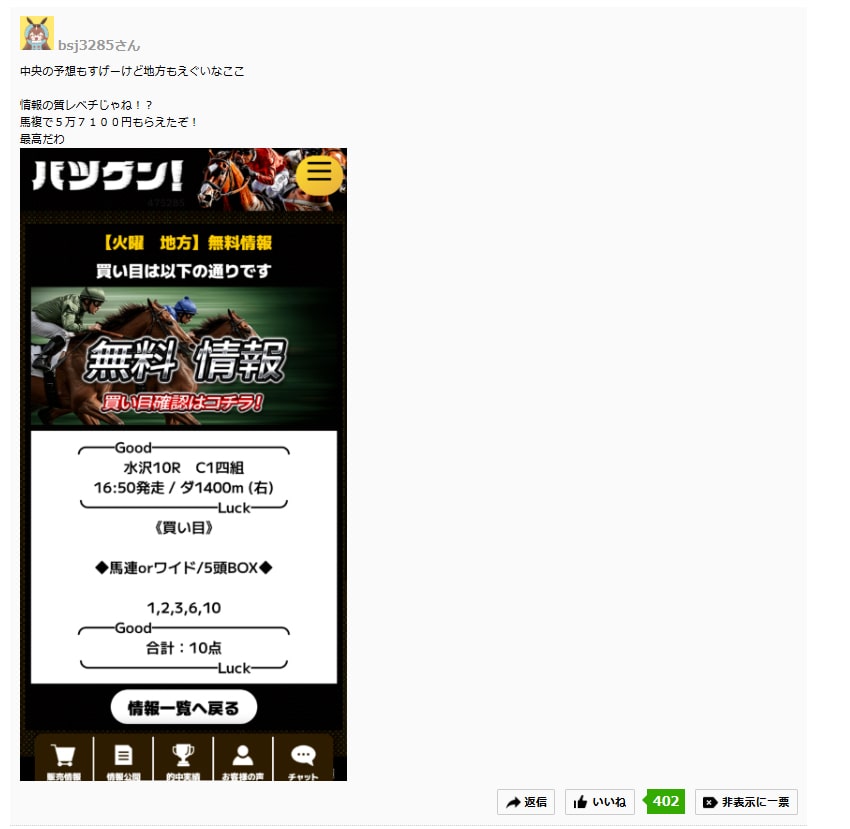 そんな悪評の【KEIBAサンシャイン】は置いといて、前回の検証でもご紹介した【バツグン】は皆様ご登録されましたか?