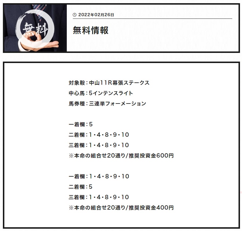 中山11R無料情報で83,160円的中。