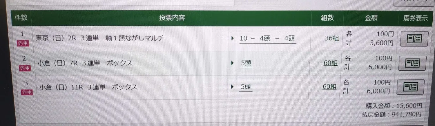 1点500円で馬券買っていたから一撃18万4800円獲得、地味に荒れたから的中嬉しすぎます。